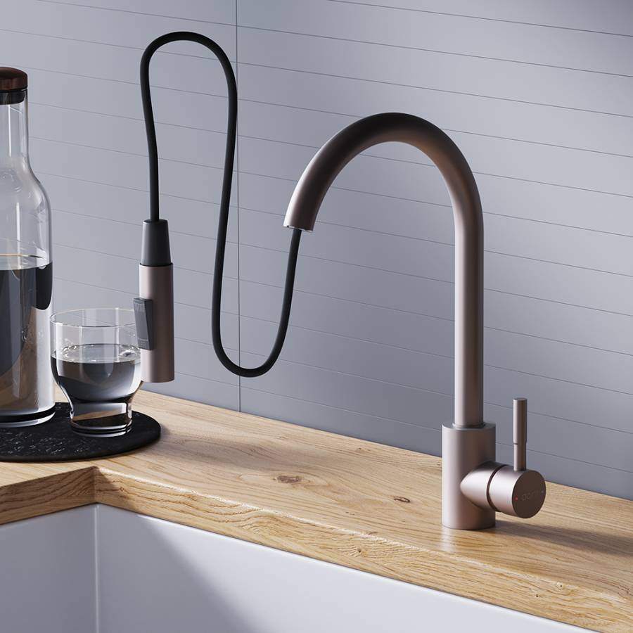 Утонченный элегантный дизайн сохранит свою актуальность на долгие годы и останется украшением на вашей кухне. Матовое покрытие в цвете Сатин - никаких разводов и следов капель безупречный внешний вид смесителя всегда. Удобная эргономичная ручка-стик обеспечивает легкое управление напором воды в одно касание._x000D_