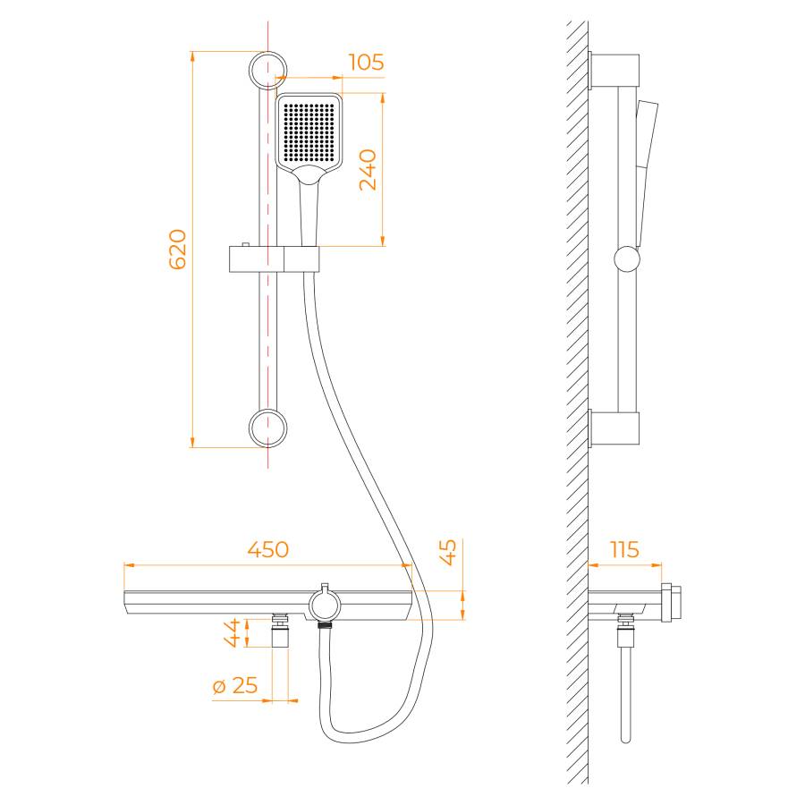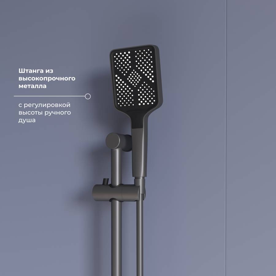 Металлическая штанга с регулировкой высоты держателя ручного душа обеспечивает идеальное положение для пользователя, позволяя подстроить его под любые индивидуальные предпочтения. Ручной душ выполнен из устойчивого к износу ABS-пластика и имеет гибкий шланг длиной 1.5 м с тремя режимами струи, что гарантирует разнообразие в использовании и удобство при душевых процедурах.